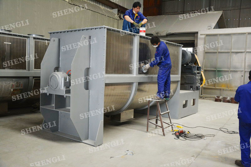 工作原理:臥式攪拌機采用U型筒體,內(nèi)設(shè)平行主軸,主軸上安裝若干傾角式槳葉刀,不僅能快速高效的攪拌物料,且不會破壞物料,不會卡料。