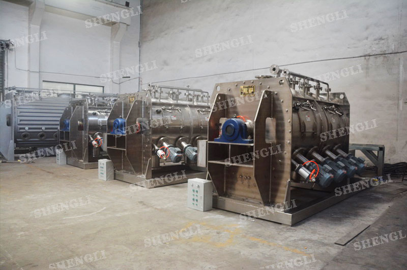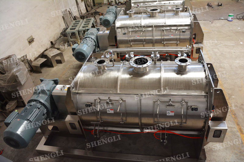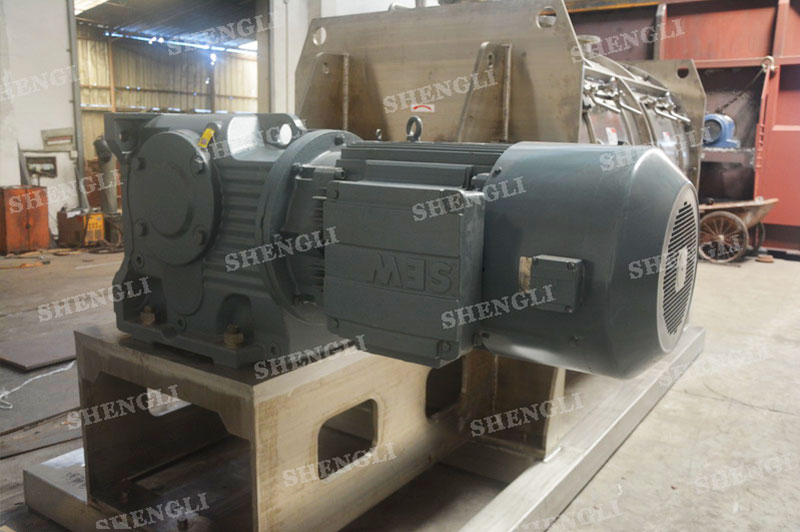 工作原理:臥式犁刀攪拌機采用臥式圓柱筒體,內設平行主軸,主軸上安裝若干犁式刀頭,通過較快的旋轉速度,分割、重合物料,實現(xiàn)快速攪拌的功能,常結合1500-3000轉高速剪切飛刀相互作用。