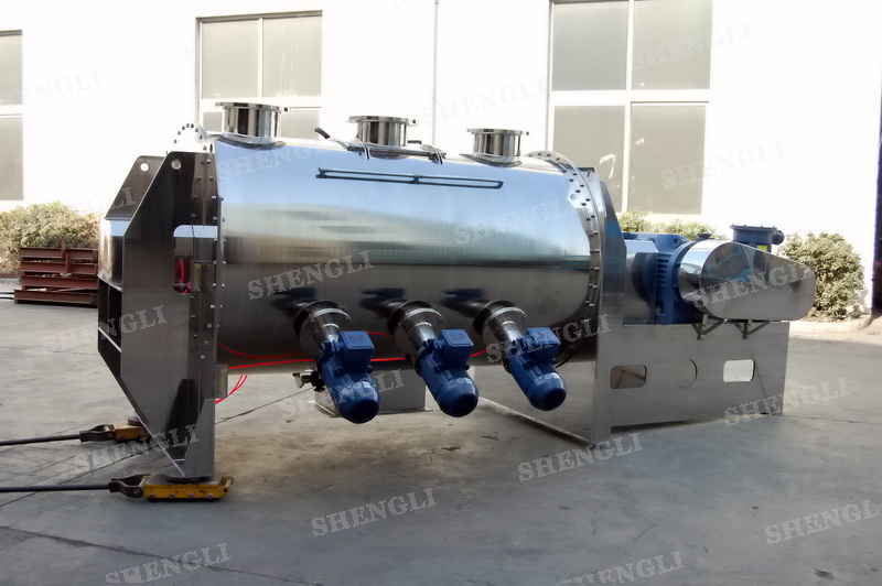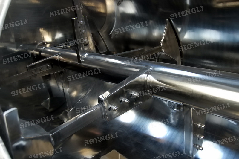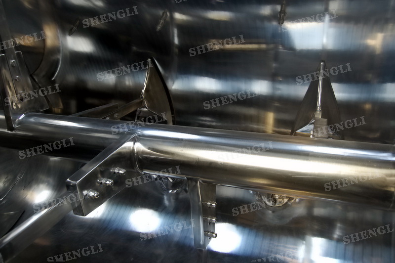 工作原理:犁刀攪拌機采用臥式圓柱筒體,內設平行主軸,主軸上安裝若干犁式刀頭,通過較快的旋轉速度,分割、重合物料,實現快速攪拌的功能,常結合1500-3000轉高速剪切飛刀相互作用。