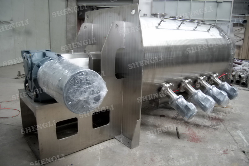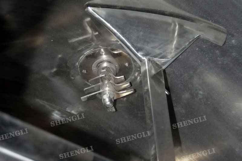 工作原理:犁刀式攪拌機采用臥式圓柱筒體,內設平行主軸,主軸上安裝若干犁式刀頭,通過較快的旋轉速度,分割、重合物料,實現快速攪拌的功能,常結合1500-3000轉高速剪切飛刀相互作用。
