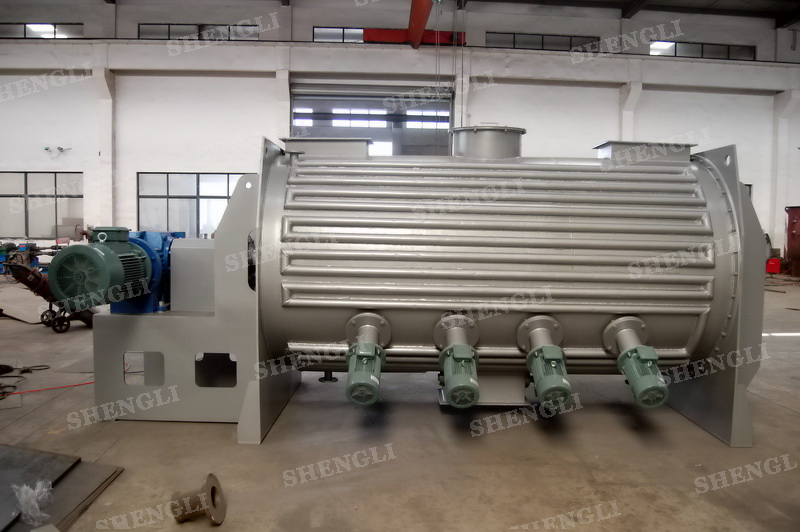 工作原理:犁刀臥式混料機采用臥式圓柱筒體,內設平行主軸,主軸上安裝若干犁式刀頭,通過較快的旋轉速度,分割、重合物料,實現快速攪拌的功能,常結合1500-3000轉高速剪切飛刀相互作用。