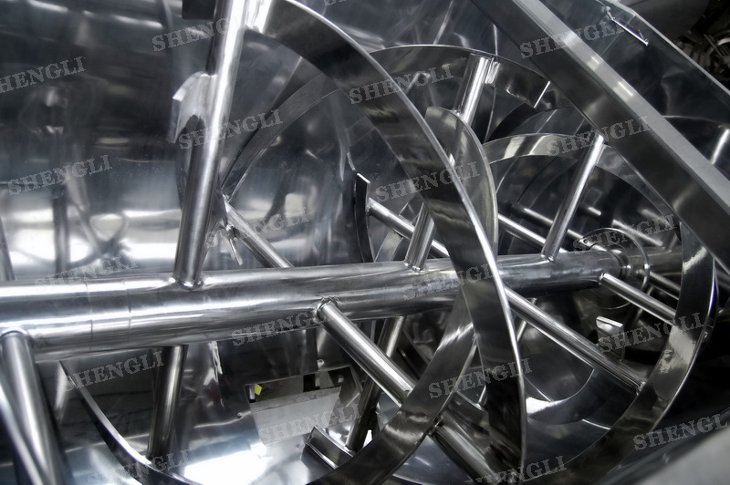 工作原理:螺帶臥式混合機采用U型筒體,內裝平行主軸,主軸上安裝正反雙向的盤條螺帶,不同維度螺帶分內螺帶與外螺帶,物料在螺帶的驅使下反復參混,能夠快速高效的混合。